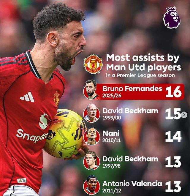 至此,B费将个人本赛季英超数据刷新至27轮7球16助,打破贝克汉姆在99-00赛季创造的曼联队史单赛季球员助攻次数纪录,断崖式领跑联赛助攻榜!